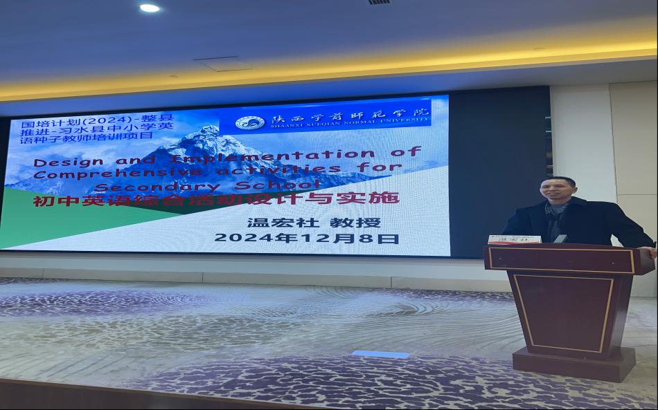 申搏外国语学院温宏社教授应国家开放大学邀请于2024年12月8日参加在贵州革命文化研究中心举办的“国培计划(2024)”-整县推进-习水县中小学英语种子教师能力提升培训项目,做了题为“初中英语综合活动设计与实施”的专题讲座。“国培计划(2024)”-整县推进-习水县中小学英语教师能力提升培训项目是由贵州省教育厅发文,国家开放大学组织。项目旨在贯彻习近平新时代中国特色社会主义思想和党的二十大精神,落实《中共中央国务院关于全面深化新时代教师队伍建设改革的意见》《新时代基础教育强师计划》要求。项目培训于12月4日-12月8日举行,培训中小学英语种子教师100人。温宏社教授讲座围绕初中英语综合活动设计与实施,内容涵盖概述、理论基础、设计原则、教学活动设计、综合活动的设计与实施、综合活动案例分析、英语综合活动的教学资源七大部分。既包括初中英语综合活动设计理念、理论,又包括初中英语综合活动设计实践及典型案例。既有精彩的视频呈现,又带有较多亲手制作的教学工具,讲座激情饱满,极具感染力。