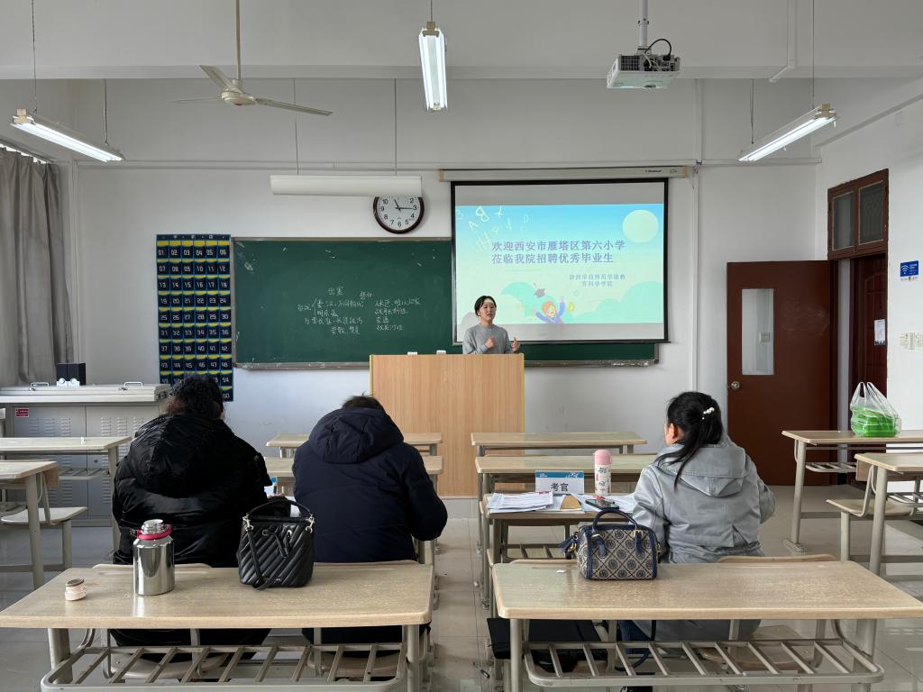 招聘会活动现场气氛热烈。同学们纷纷向西安市浐灞第二小学投递简历,双方就工作内容、岗位特点、发展前景和薪资待遇等方面深入交流洽谈;同时西安市雁塔区第六小学就招聘岗位要求对16名语文老师和13名数学老师进行试讲,雁塔六小招聘老师对我院学生给予充分肯定,并与同学们初步确定了就业意向。副院长潘炳超与参会单位以及学生亲切交流,聆听用人单位对学院人才培养、就业工作的意见建议,询问关怀毕业生的就业意向与求职进展。