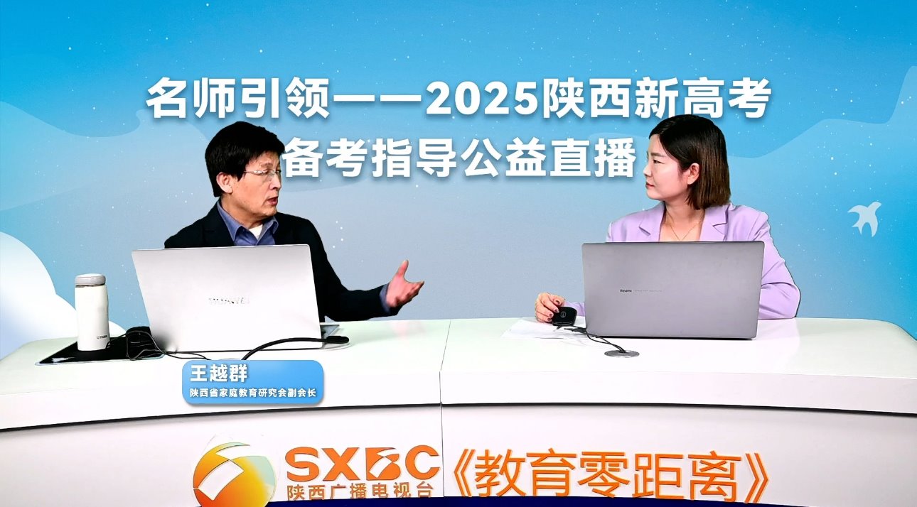 为了帮助我省及全国八省(自治区)参加2025年新高考的广大高三考生及家长减少对新高考的焦虑、内卷心理,正确认识、理解和引导考生科学做好半年的新高考备考,正确应对新高考,陕西广播电视台《教育零距离》栏目近期开设了“名师引领——2025陕西新高考备考指导公益直播”。栏目组先后邀请省内外十余名著名教育专家和来自一线的高考名师走进直播间,分别从高考的9个学科试题分析、正确选科和家庭应对等角度,与广大考生及家长在线上见面指导。陕西省家庭教育研究会副会长、陕西省基础教育教学指导委员会家庭教育专委会副主任委员、申搏老教授协会会长及区域教育发展研究院王越群教授,应邀于新年元旦晚19点至21点做客直播间,向广大家长做了《面对新高考,家长如何破“卷”》的直播分享。