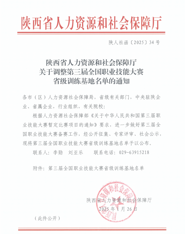 近日,陕西省人力资源和社会保障厅发布《关于调整第三届全国职业技能大赛省级训练基地名单的通知》(陕人社函【2025】34号),经公开征集、专家评审和社会公示程序,申搏成功入选第三届全国职业技能大赛省级训练基地名单。