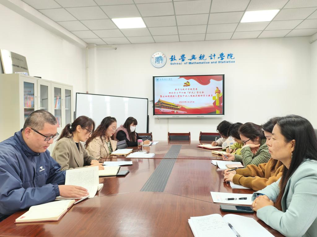 【数学与统计学院】为贯彻落实党的二十届三中全会精神和省委十四届七次全会部署安排,根据中共中央、省委教育工委、省教育厅和学校工作要求,深入贯彻中央八项规定精神学习教育,数学与统计学院党委于3月25日上午,在积学楼D319会议室召开深入贯彻中央八项规定精神学习教育暨理论学习中心组(扩大)学习会,学院党政班子、院党委委员、各党支部书记、科级干部、辅导员等参加会议。院党委书记田彩萍主持会议。