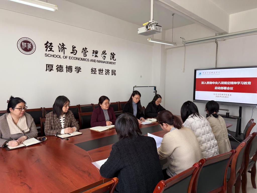 【经济与管理学院】3月20日下午,经济与管理学院党委召开深入贯彻中央八项规定精神学习教育启动部署会议,认真学习习近平总书记关于深入贯彻中央八项规定精神学习教育的重要讲话和重要指示精神,传达学习中央、省委党的建设工作领导小组会议精神和《实施方案》要求,传达学习学校深入贯彻中央八项规定精神学习教育启动部署会议精神,正式启动学院学习教育工作。经济与管理学院党委书记陈璐主持会议并作部署要求。学院领导、院党委委员、教工及学生各党支部书记参加会议。