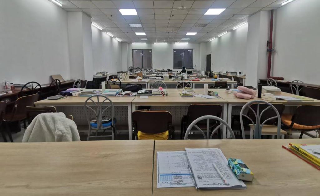 增建“公共自习室”位于图书馆一楼西侧,共设100多个座位。室内座椅均来自馆内现有资源整合调配,并对照明电路进行修缮,目前已投入使用,有效缓解了馆内公共自习座位紧张问题。