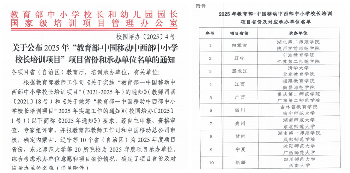 近日,接教育部中小学校长和幼儿园园长国家级培训项目管理办公室通知,申搏成功入选2025年“教育部-中国移动中西部中小学校长培训项目”全国20家承办单位之一,承担内蒙古自治区巴彦淖尔市、赤峰市共计54名管理者和中小学校长的培训任务。