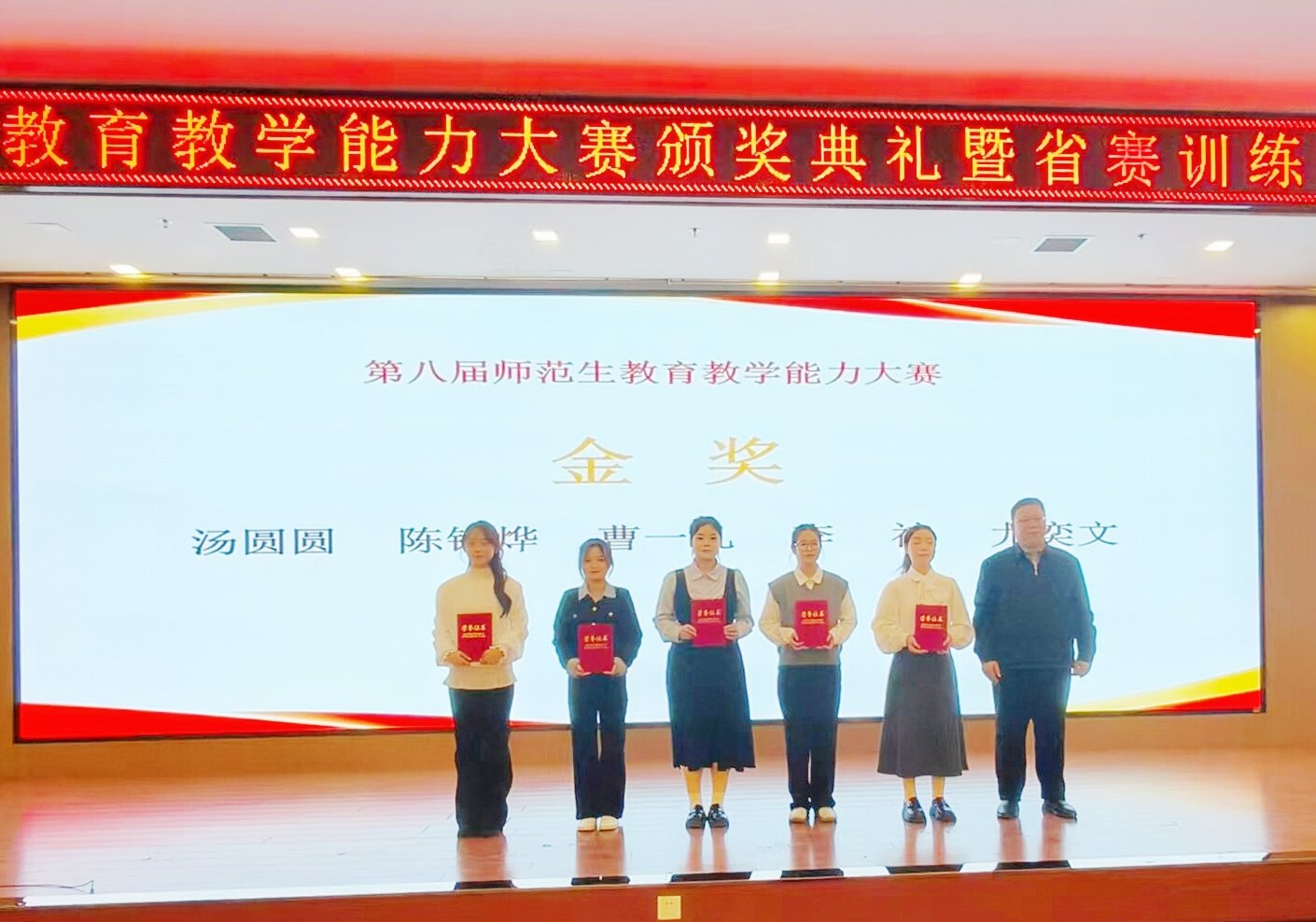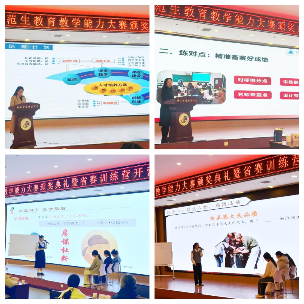 颁奖环节,教务处处长宣读了本次大赛的表彰文件,与会领导依次为获奖选手及优秀组织单位颁发荣誉证书。在金奖选手模拟授课展示环节,5位获奖学生以扎实的教学设计,将专业知识与教学技巧融为一体,充分展现出师范生过硬的教学基本功与良好的职业素养。在经验交流环节,人文学院副院长赵燕、教育科学学院副院长王碧梅、人文学院教授王丽梅、幼儿教育学院副教授叶晓晨四位教师代表,分别从统筹组织、精准赋能的视角,分享了在师范生竞赛培育中的实践经验、特色做法。
